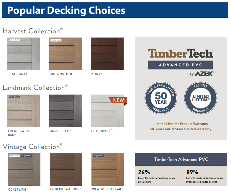 - Variety of Styles and Colors: TimberTech offers a wide range of colors and styles, allowing homeowners and builders to customize the appearance of their decks to match their aesthetic preferences and the style of their homes.