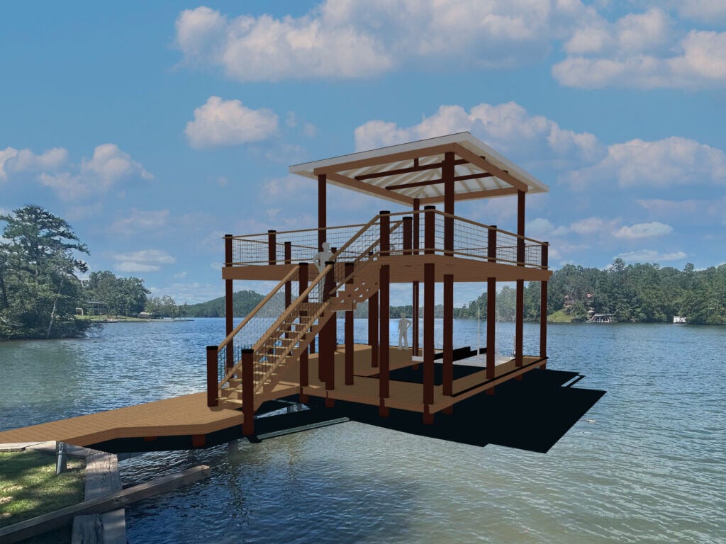 Lake Martin Dock Company provides a 3D rendering design giving the ability to visualize and tailor the dock to specific needs and preferences. This visualization can help make informed decisions about layout, materials, and features, ensuring that the final product perfectly aligns with potential buyers expectations and enhances the property’s aesthetics and functionality. This personalized approach can greatly enhance customer satisfaction and help in achieving the ideal dock design for their lakefront property.